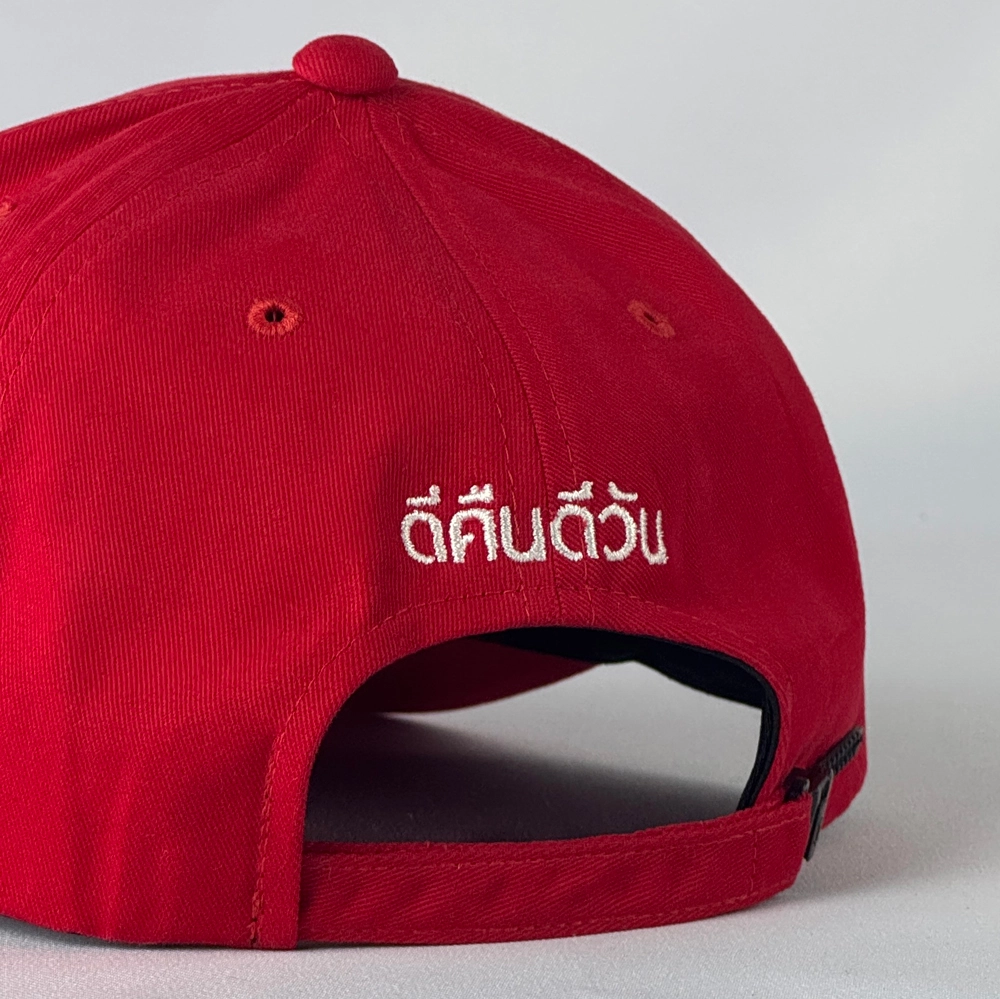 หมวกแก๊ปโหนกระแส แบบสีแดงสดสวยงาม แตกต่างจากแบบเดิมด้วยปีกมวกที่สั้นลงทำให้ดูสวยงามมากขึ้น