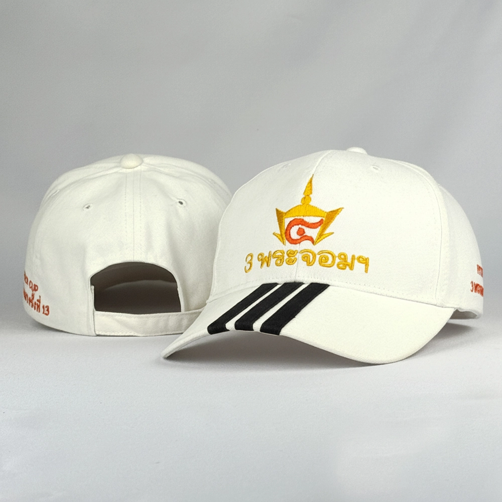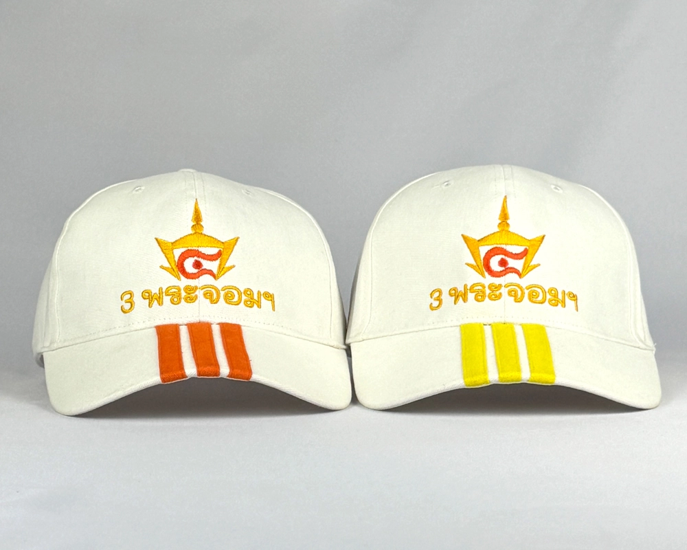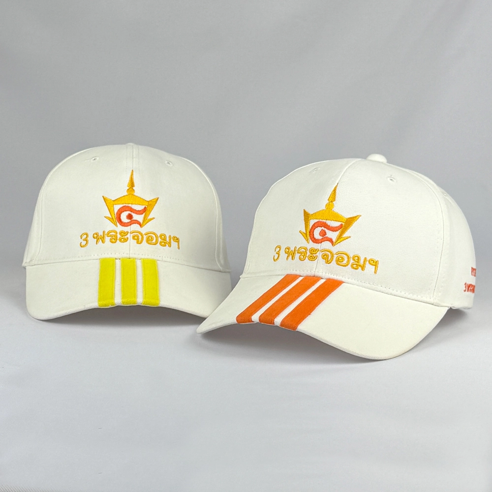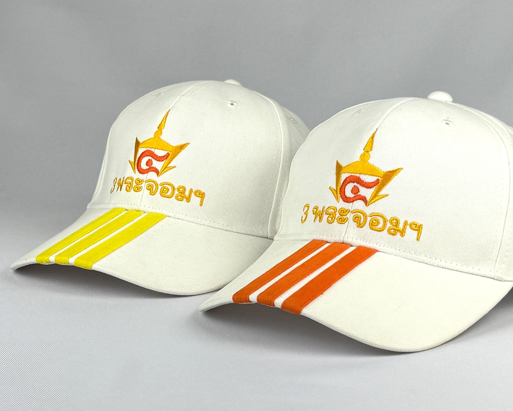 หมวกแก๊ปแบบตัดต่อปีกหมวก มีแถบเส้น 3 เส้นที่ปีกหมวก สามารถเลือกเปลี่ยนสีได้ พร้อมปักด้านข้างและหน้าหมวกเป็นโลโก้ตามต้องการ