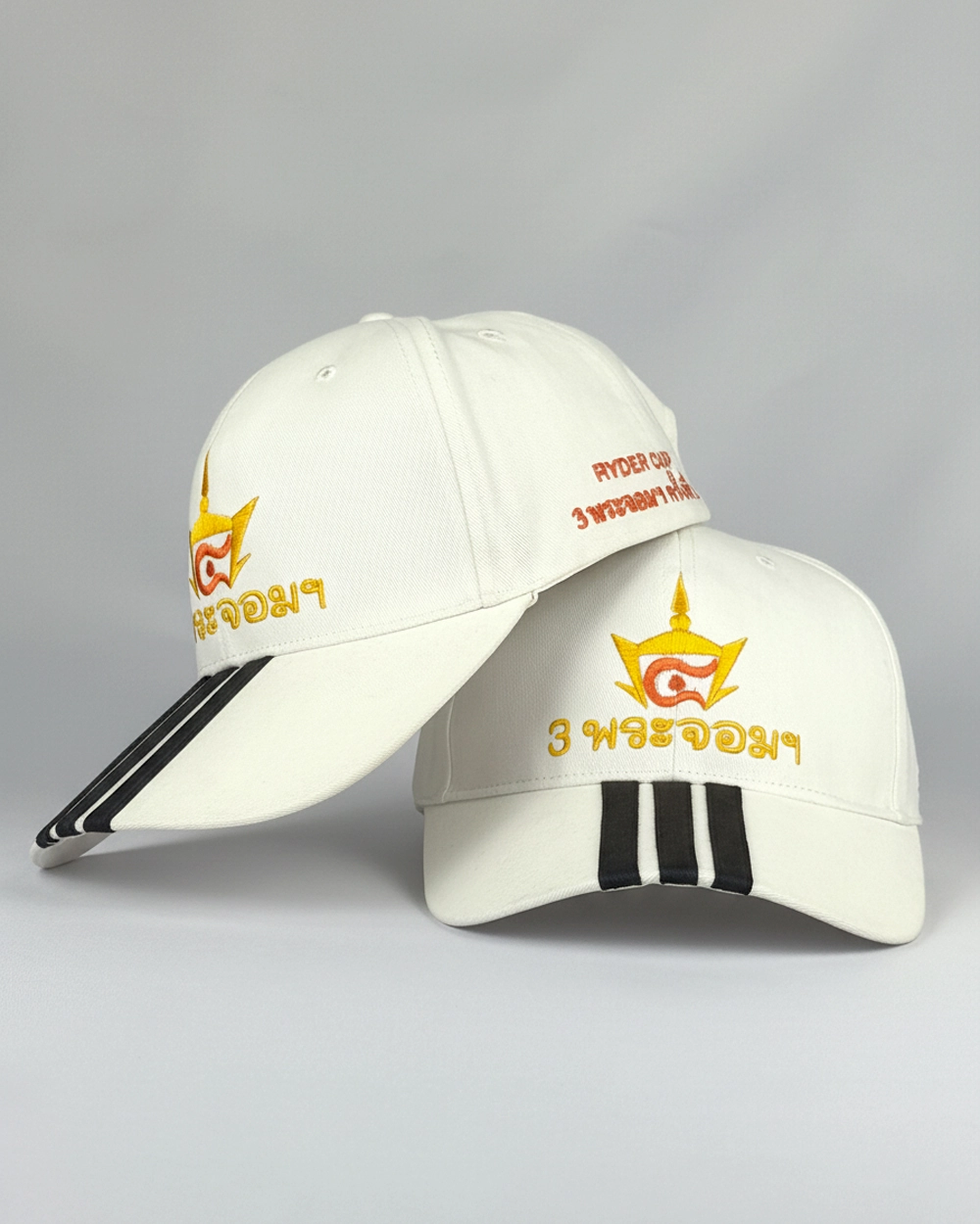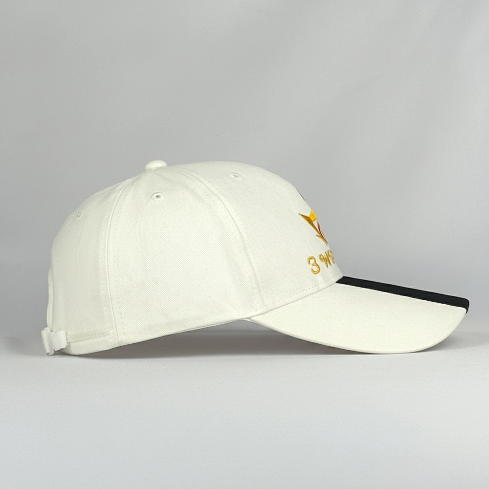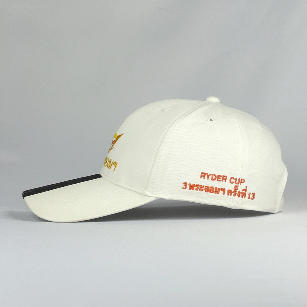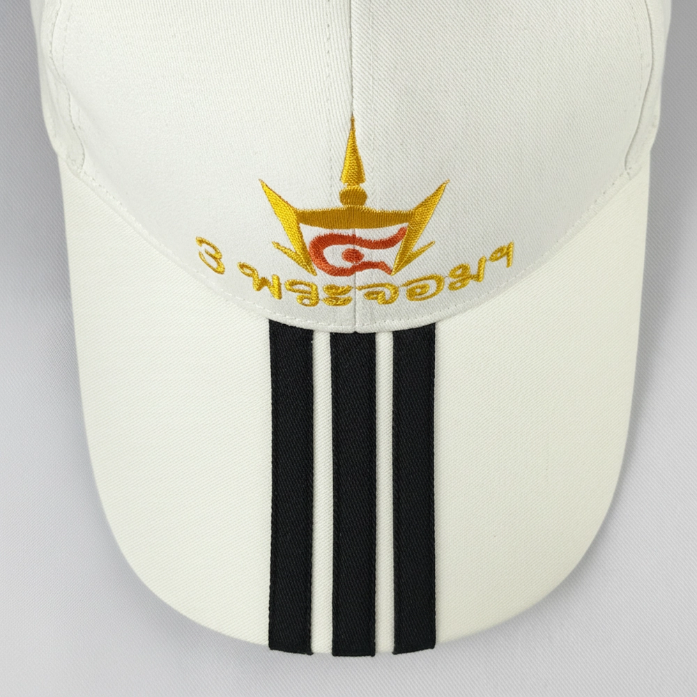 หมวกแก๊ปแบบตัดต่อปีกหมวก มีแถบเส้น 3 เส้นที่ปีกหมวก สามารถเลือกเปลี่ยนสีได้ พร้อมปักด้านข้างและหน้าหมวกเป็นโลโก้ตามต้องการ