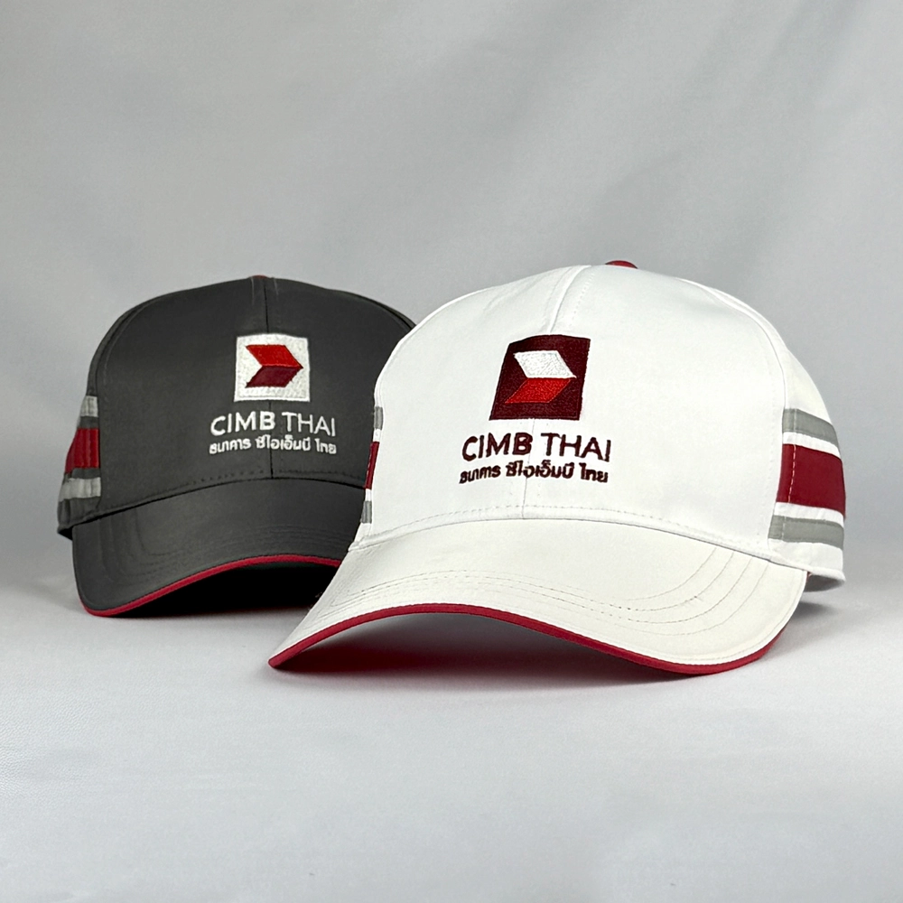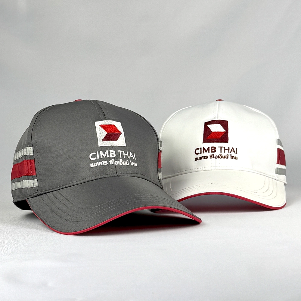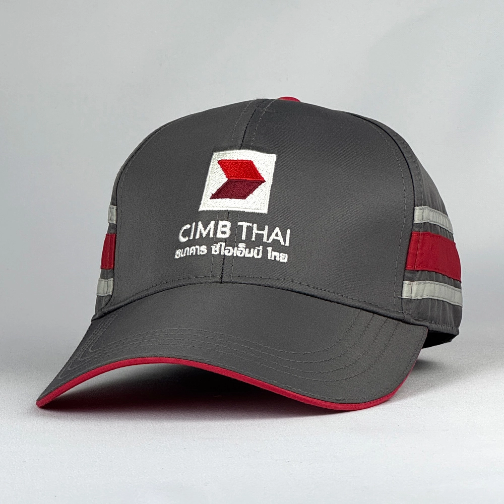 หมวกแก๊ป CIMB มีแถบด้านข้างเพิ่มความสวยงาม พร้อมปีกหมวกสีทูโทน ทำใ้ดูมีเอกลักษณ์โดดเด่นเพิ่มมากยิ่งขึ้น