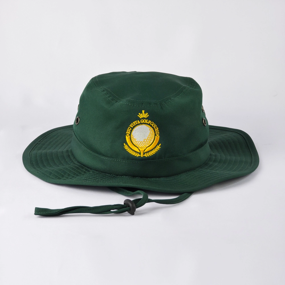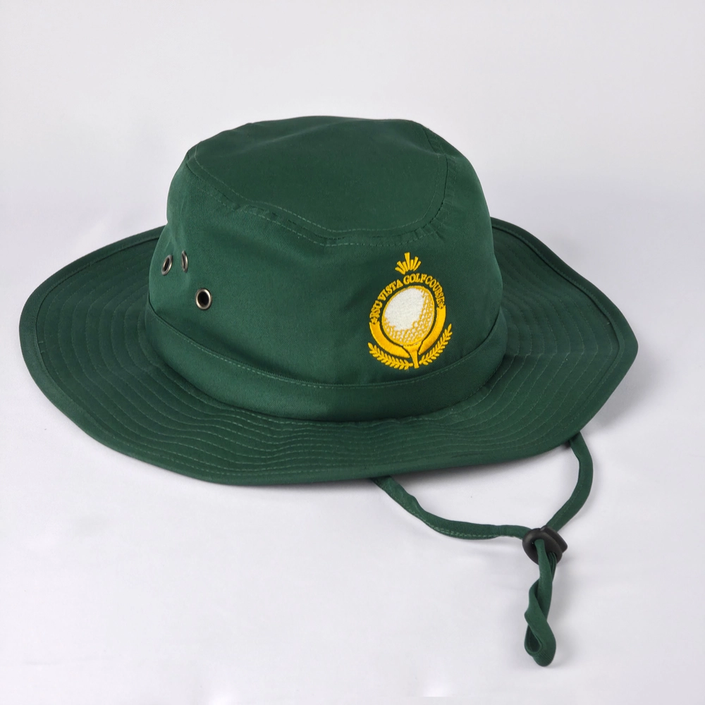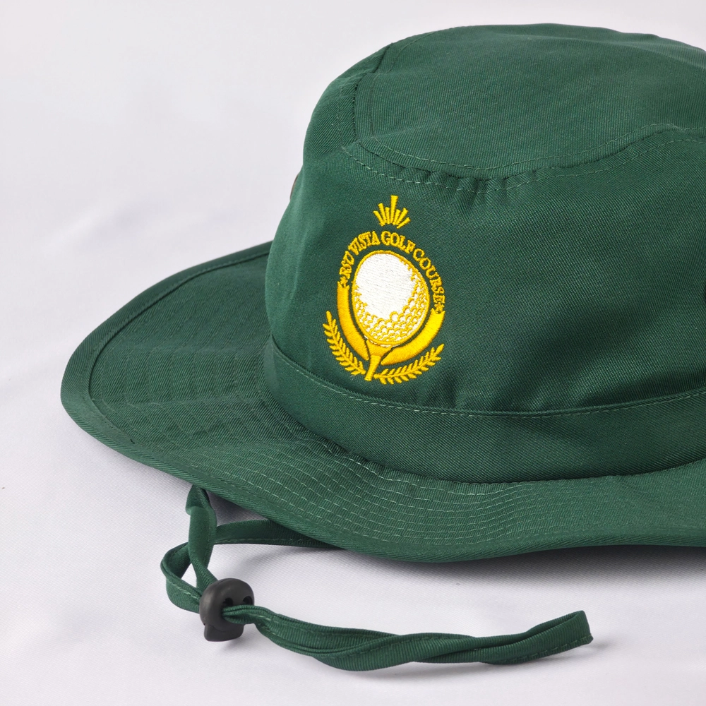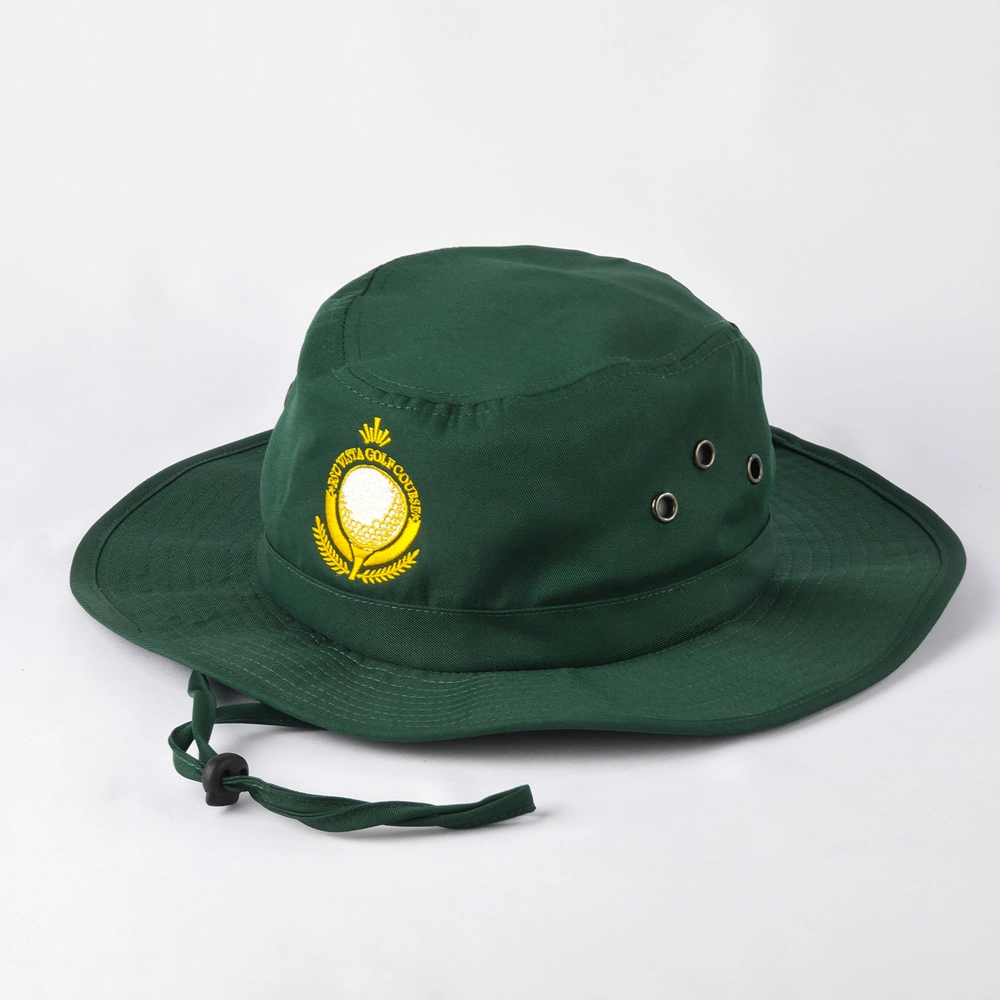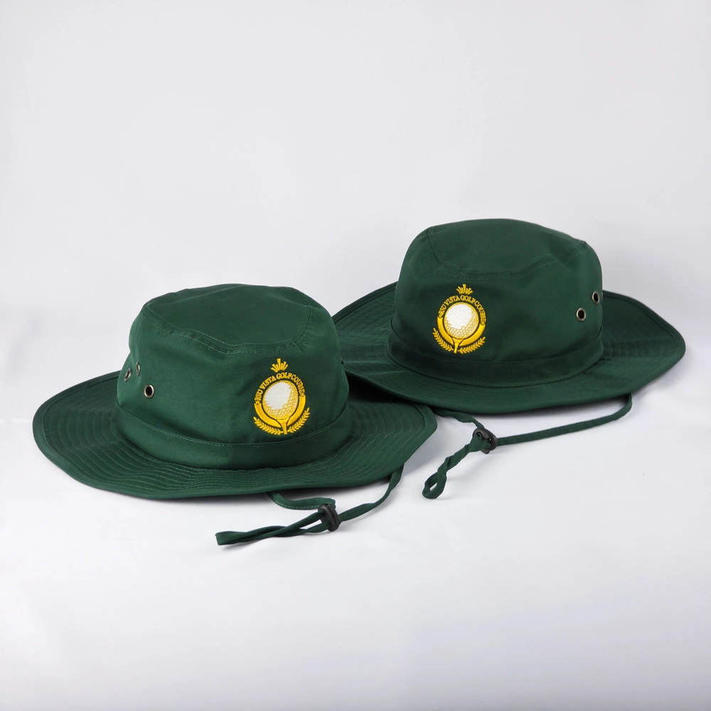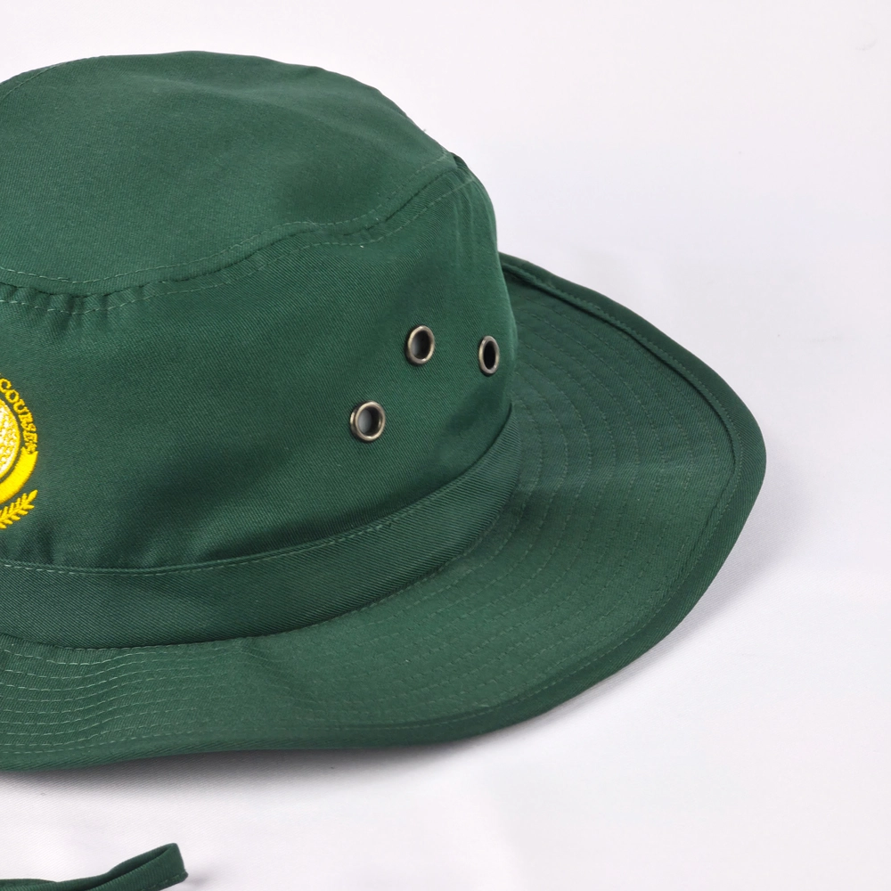 หมวกซาฟารีสีเขียวล้วนทั้งใบ พร้อมงานปักโลโก้ RSU ด้านหน้าหมวก ตัวอย่างผลงานที่โรงงานทำหมวกของเราผลิตให้กับลูกค้า