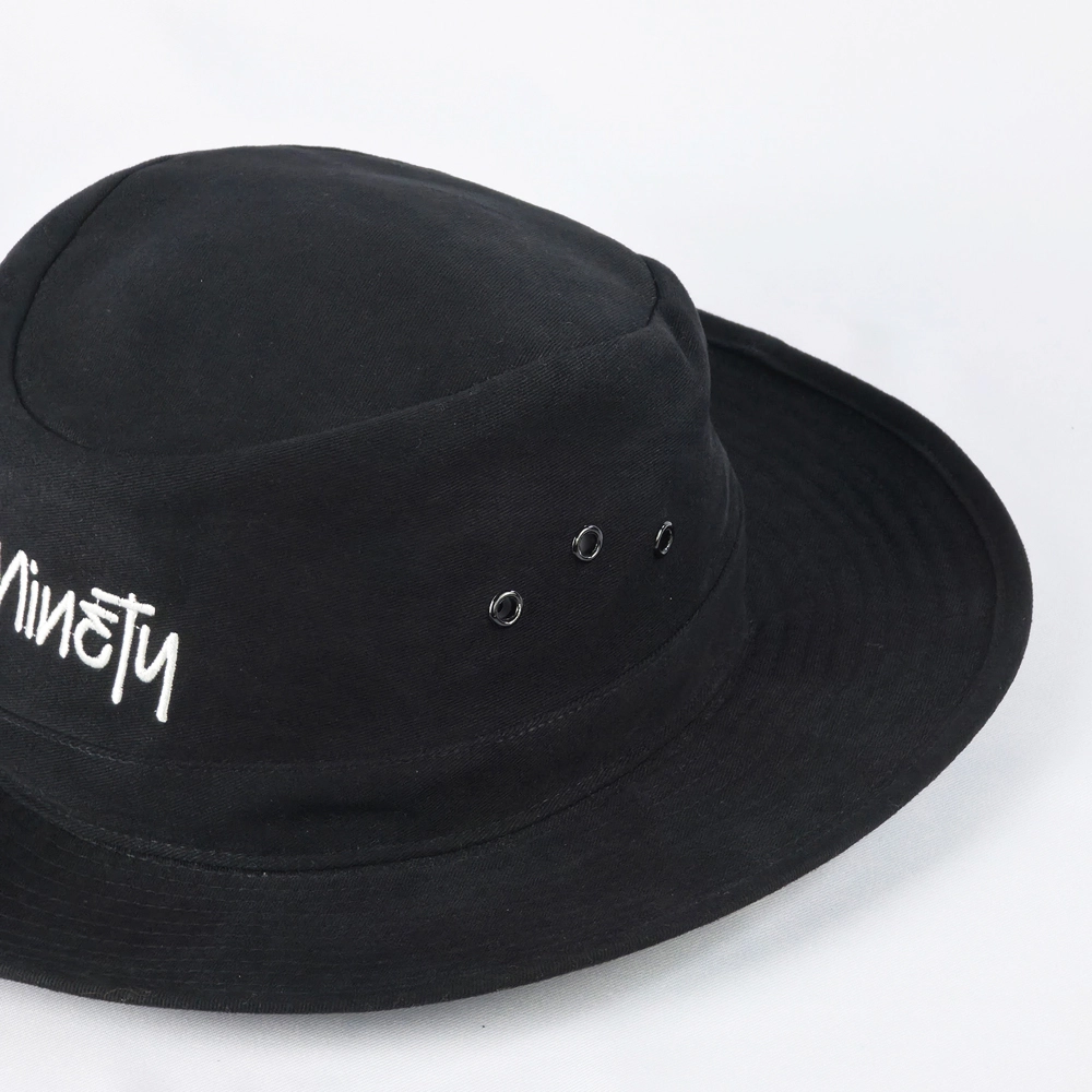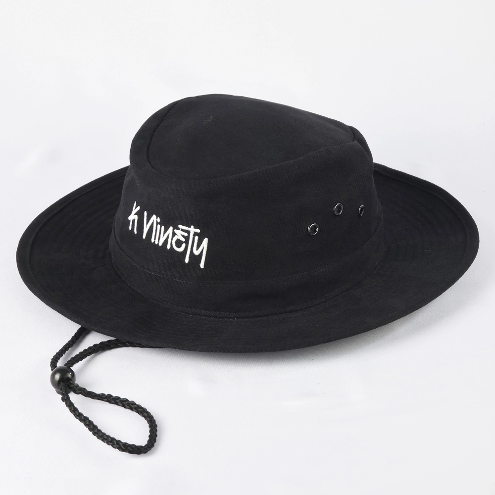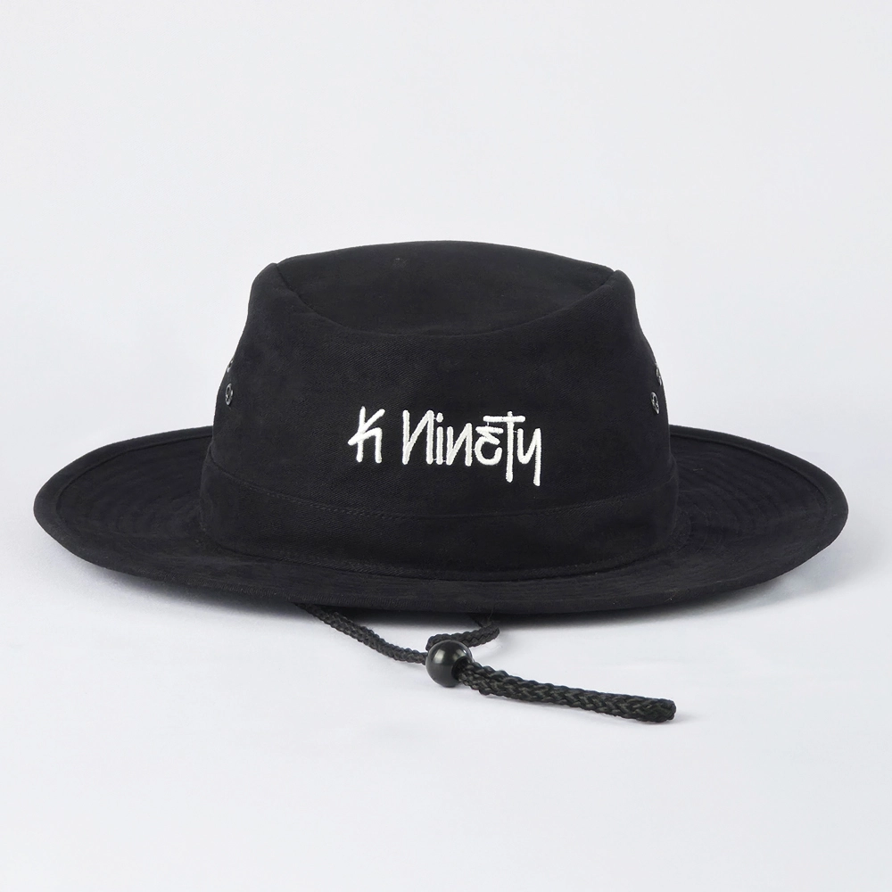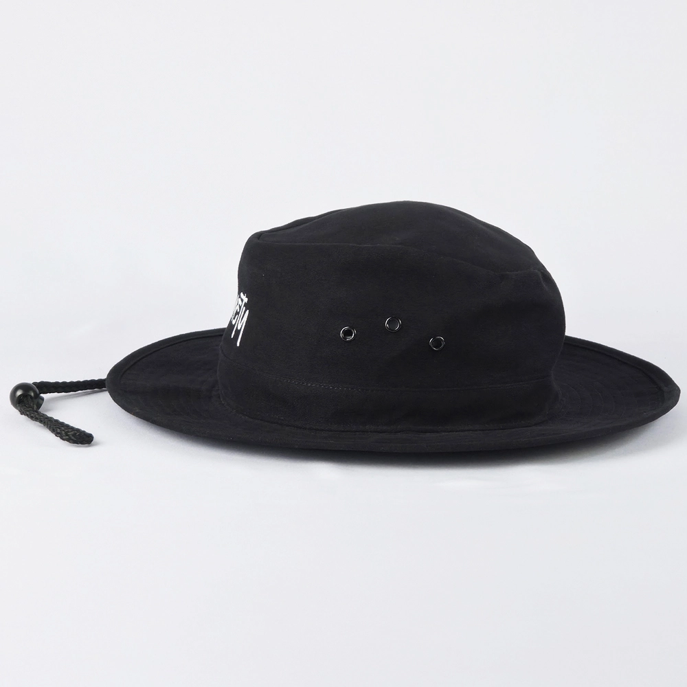 หมวกปีกรอบสีดำล้วนทั้งใบ พร้อมงานปีกโลโก้ 1 ตำแหน่งชิ้นหน้า และเพิ่มสายรัดคางให้กับตัวหมวก