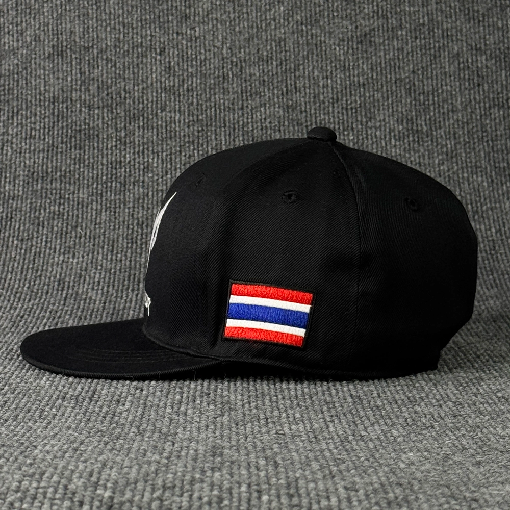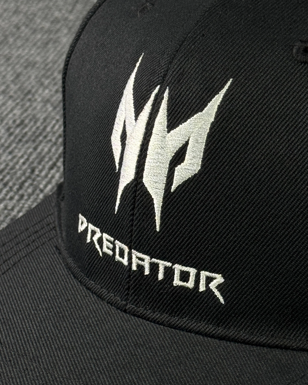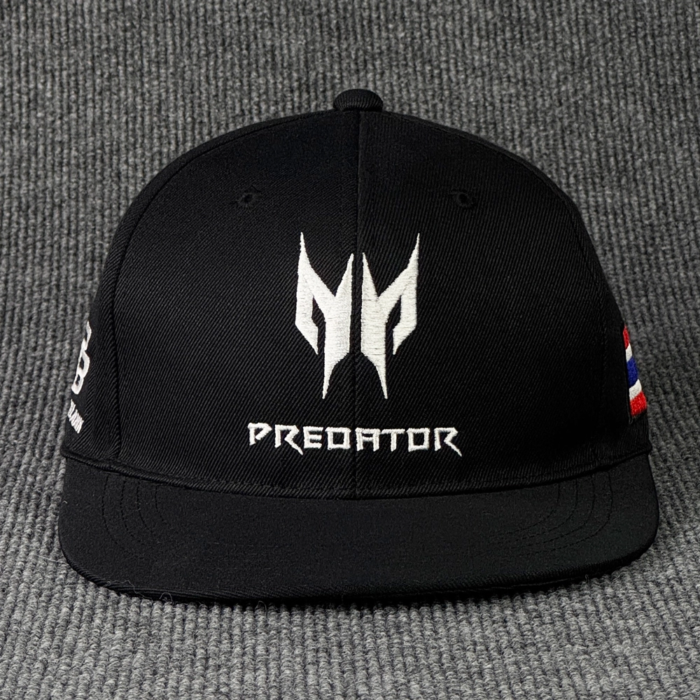 ตัวอย่างผลงานผลิตหมวกฮิปฮอป งาน PREDATOR สีดำล้วนทั้งใบ พร้อมงานปักโลโก้ 3 ตำแหน่ง ไม่มีหางหมวกด้านหลัง