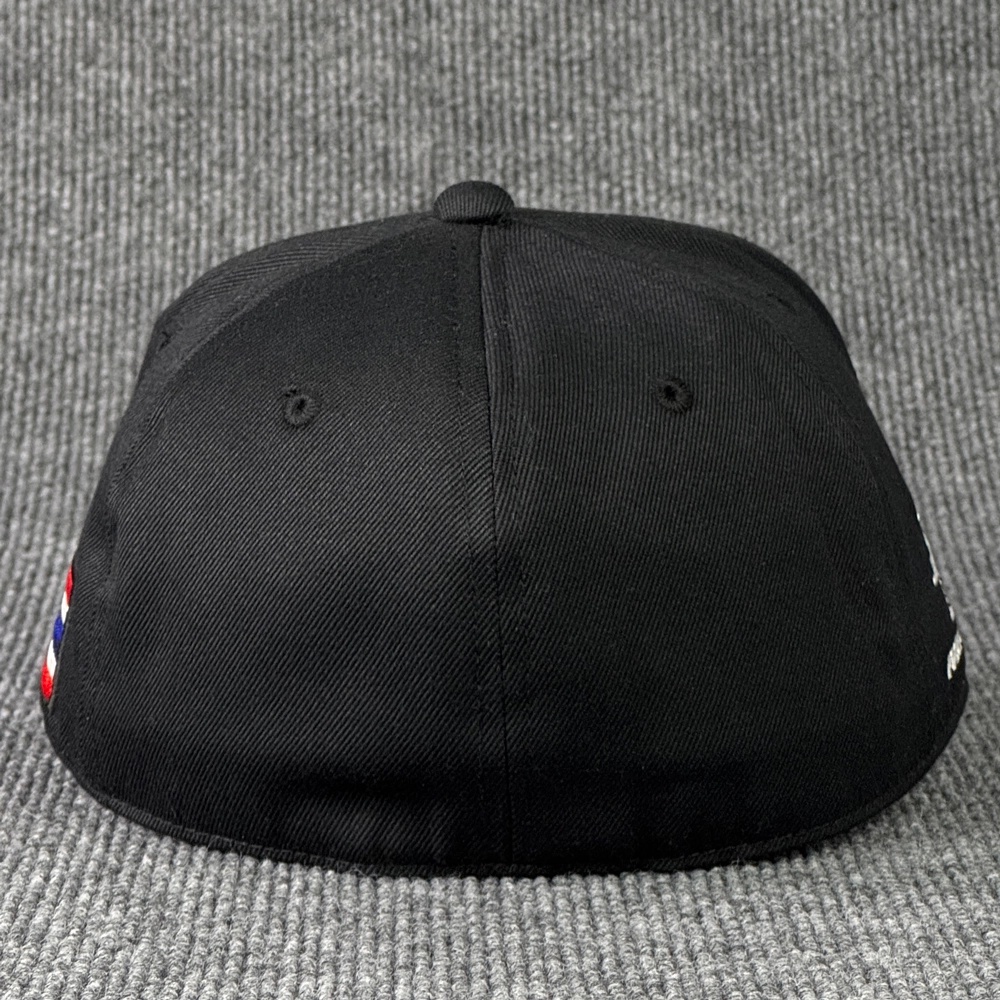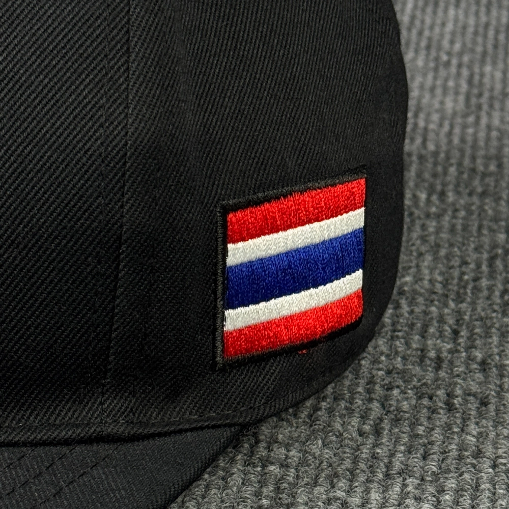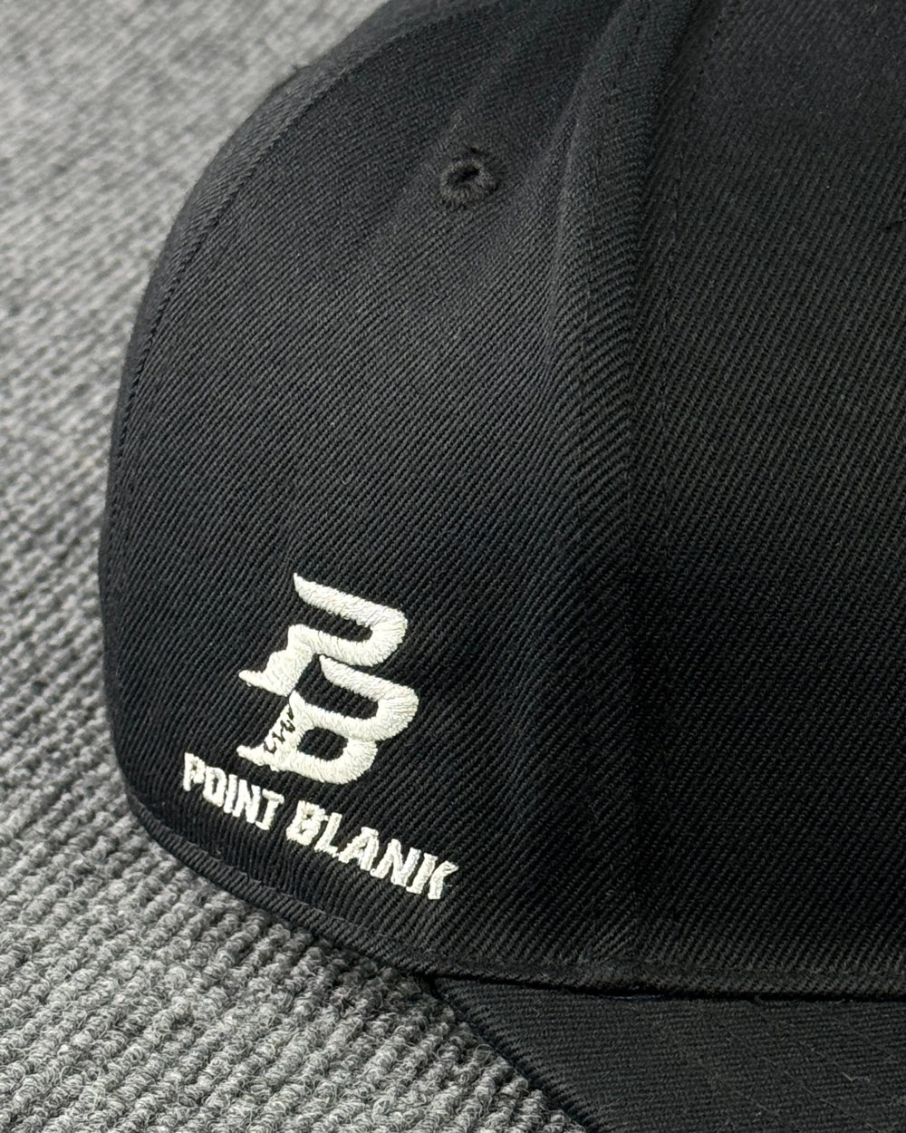 ตัวอย่างผลงานผลิตหมวกฮิปฮอป งาน PREDATOR สีดำล้วนทั้งใบ พร้อมงานปักโลโก้ 3 ตำแหน่ง ไม่มีหางหมวกด้านหลัง