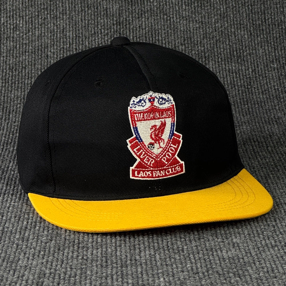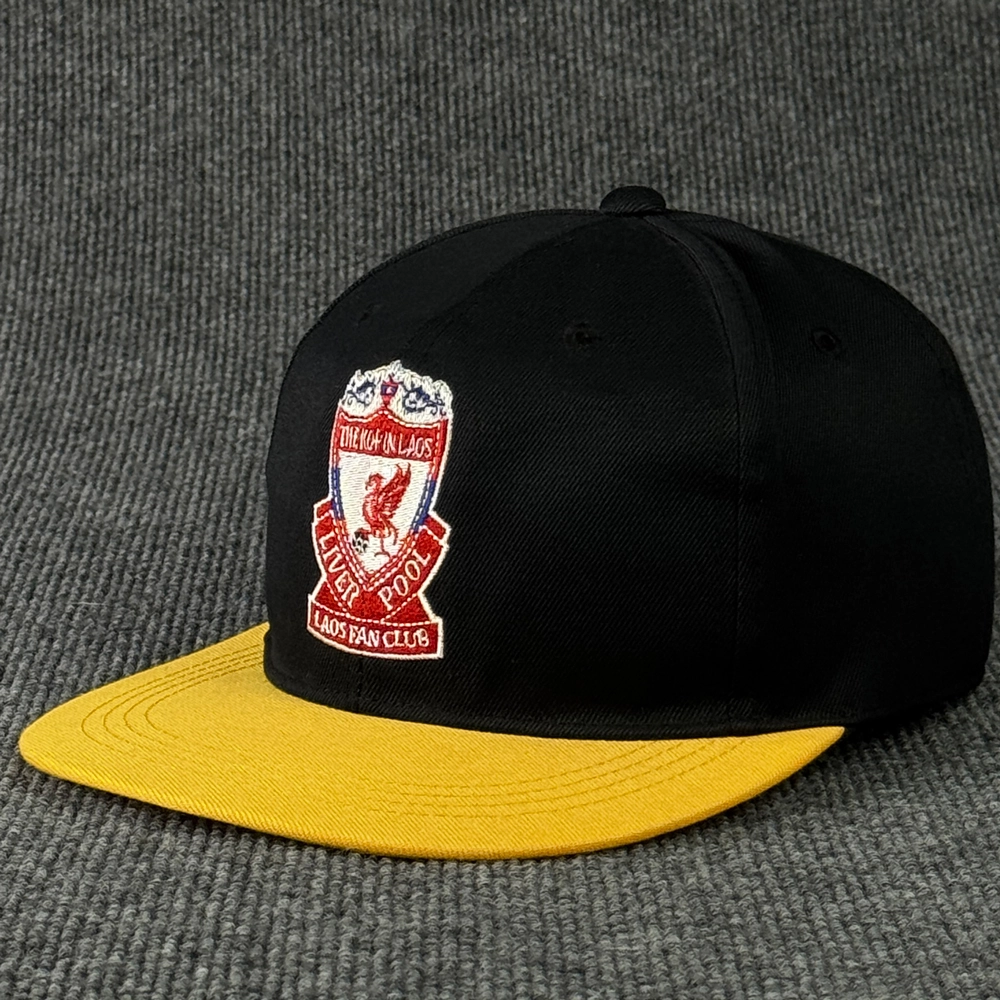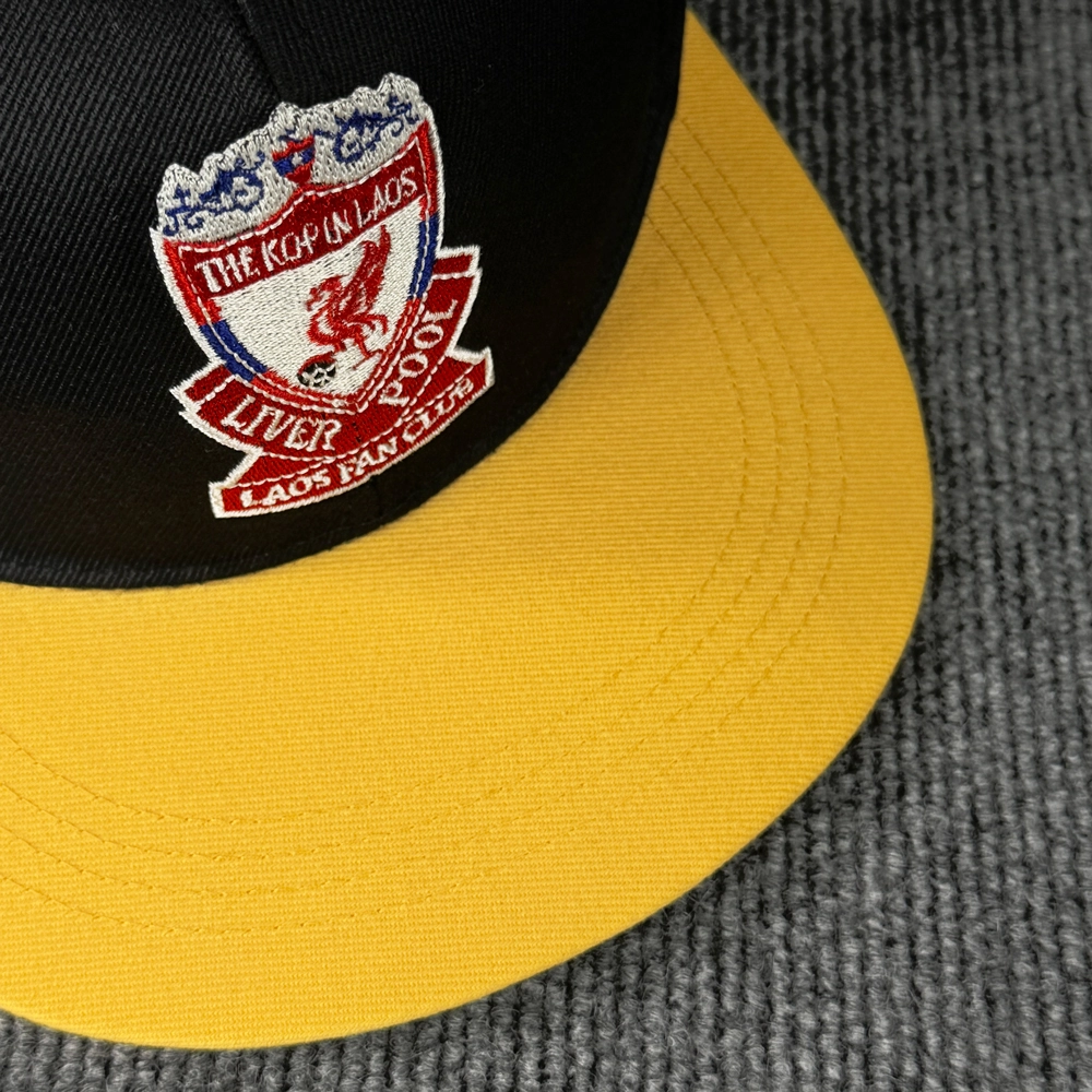 หมวกฮิปฮอปสั่งทำตามแบบของลูกค้า ผลงานหมวก Liver pool ตัวหมวกสีดำ ปีกหมวกสีเหลือง พร้อมงานปักโลโก้สโมสร