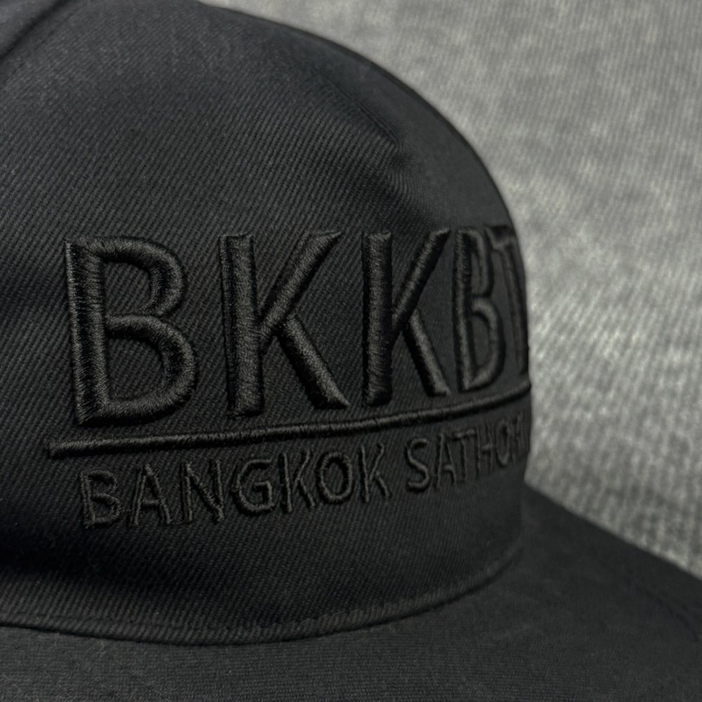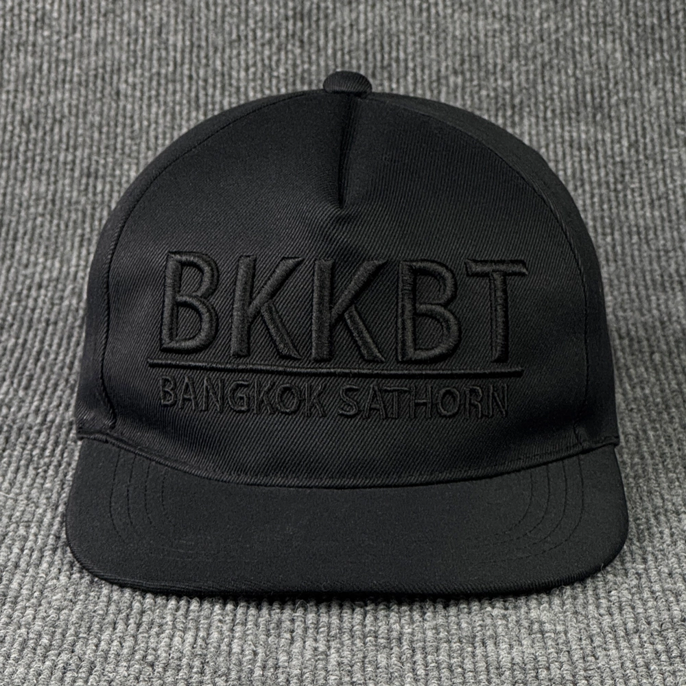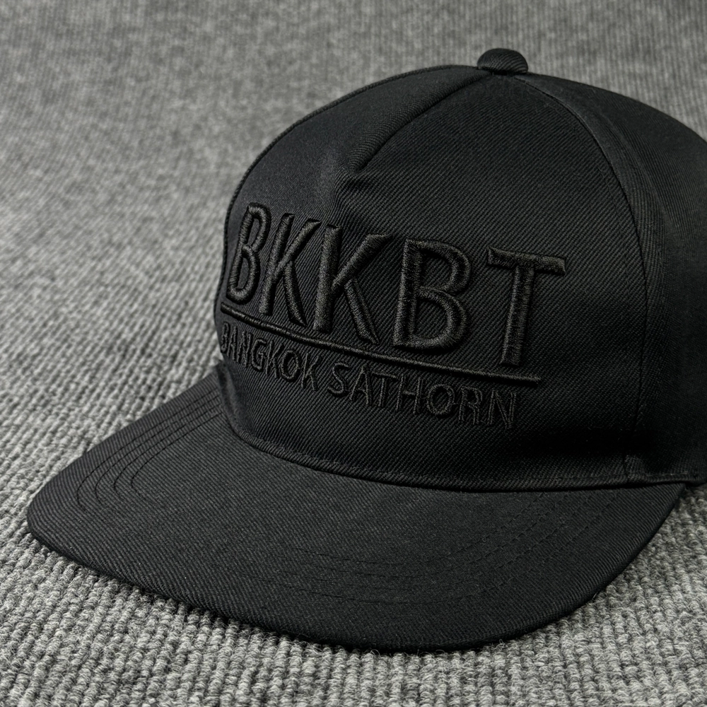 ตัวอย่างผลงานผลิตหมวก งาน BBKBT หมวกฮิปฮอปสีดำล้วนทั้งใบ พร้อมงานปักโลโก้นูน เพิ่มความพรีเมี่ยม