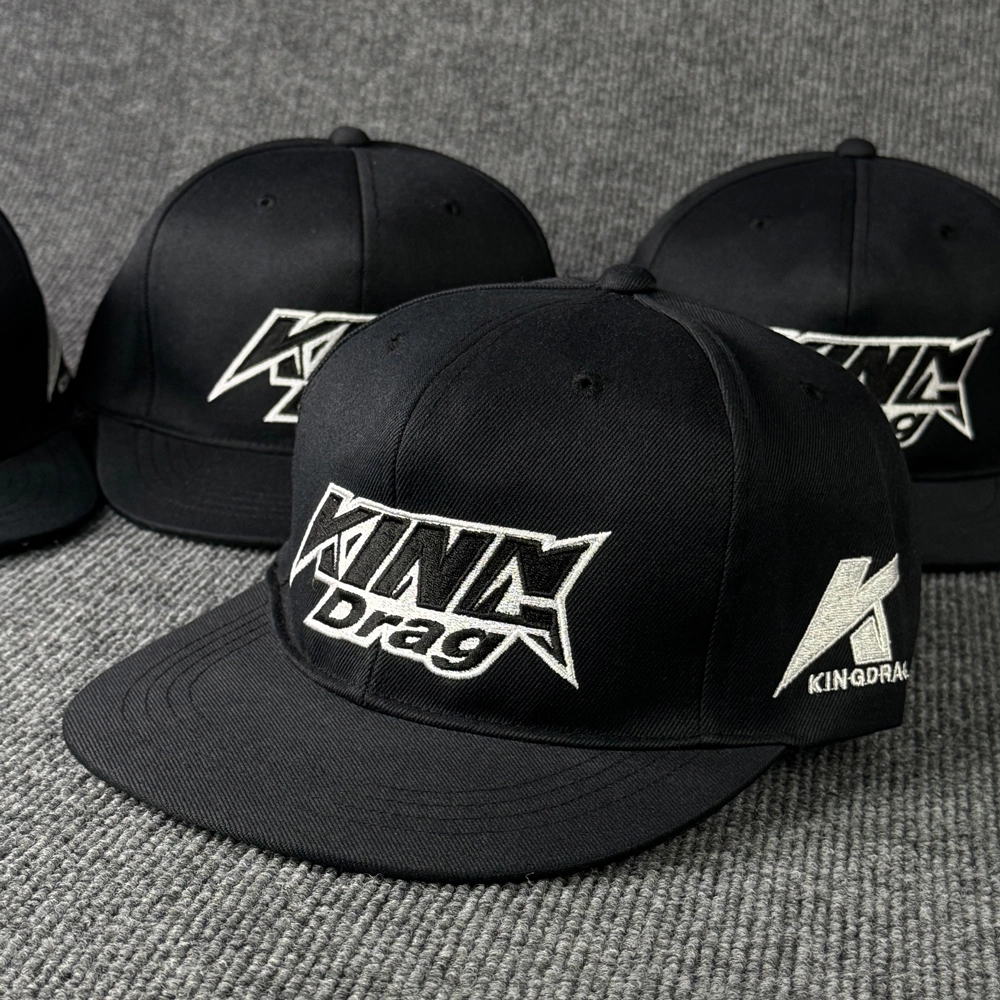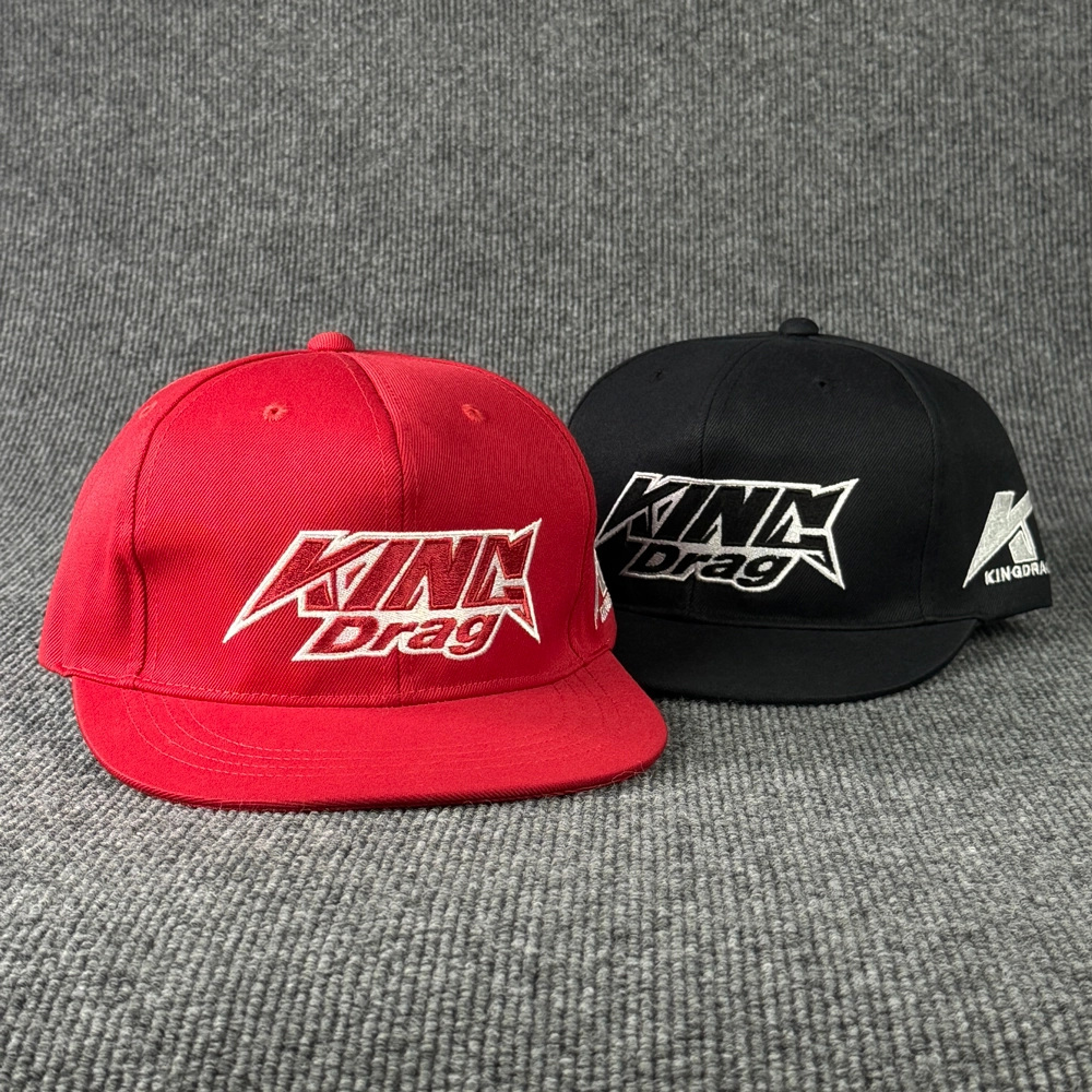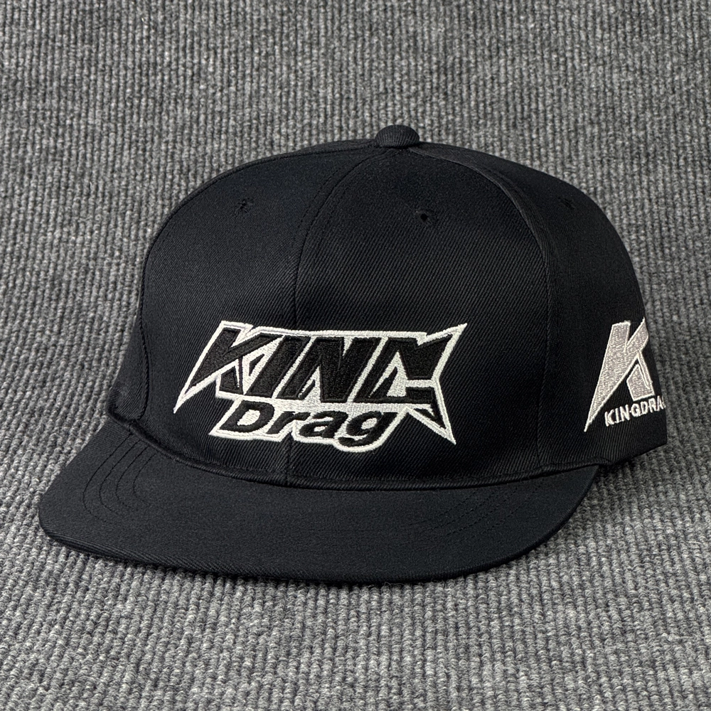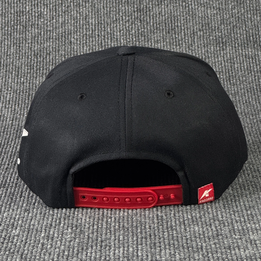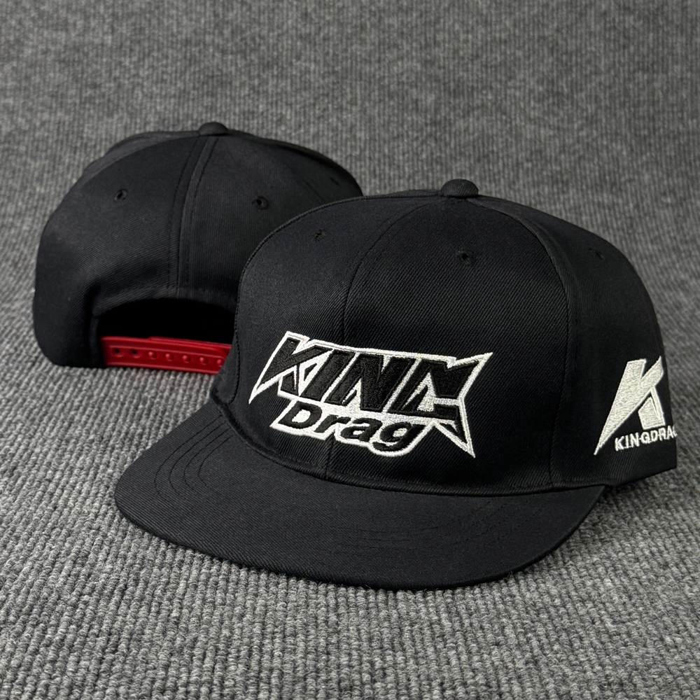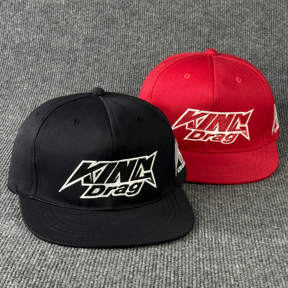 ตัวอย่างหมวกฮิปฮอป งาน King Drag แบบหมวกฮิปฮอป 2 สี สีแดง และ สีดำ พร้อมงานปักโลโก้สวยๆ