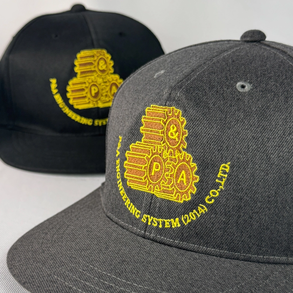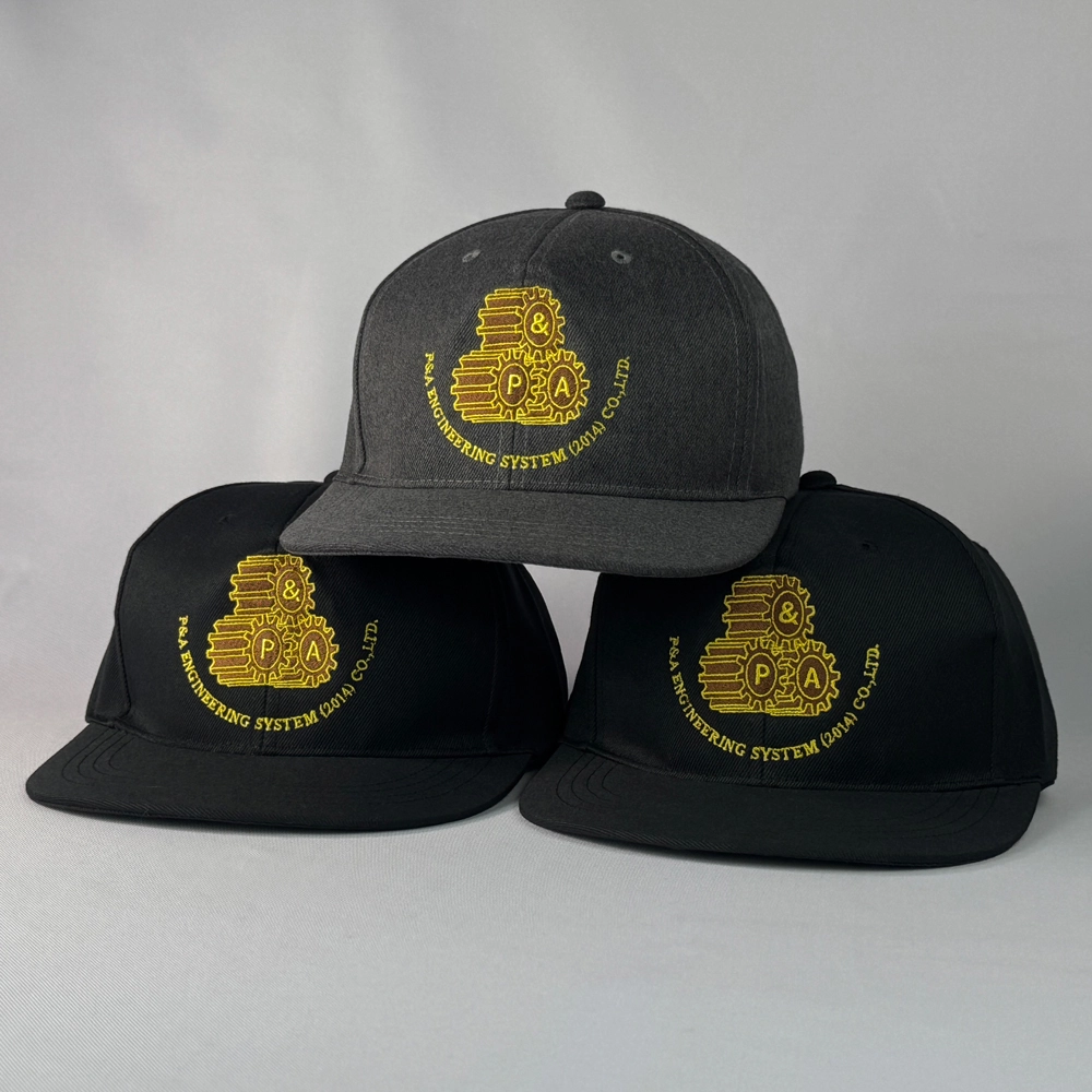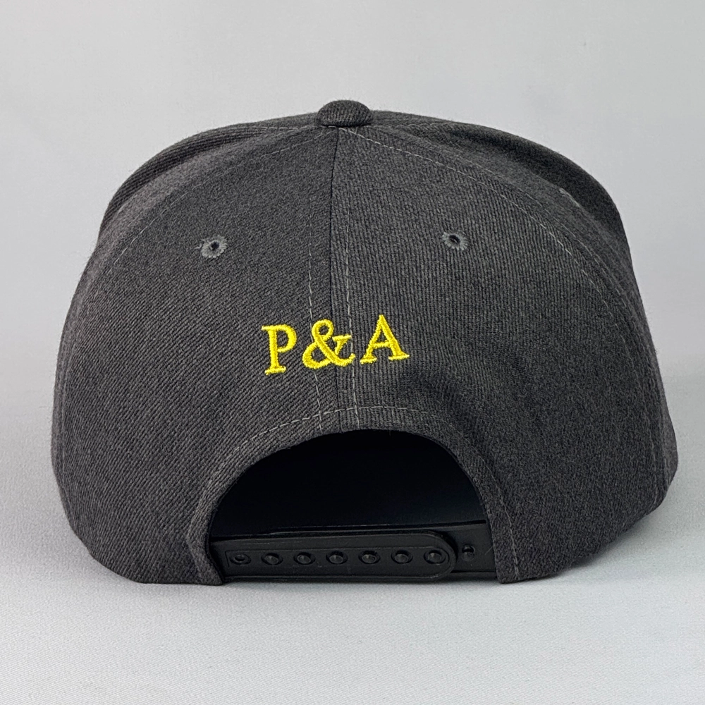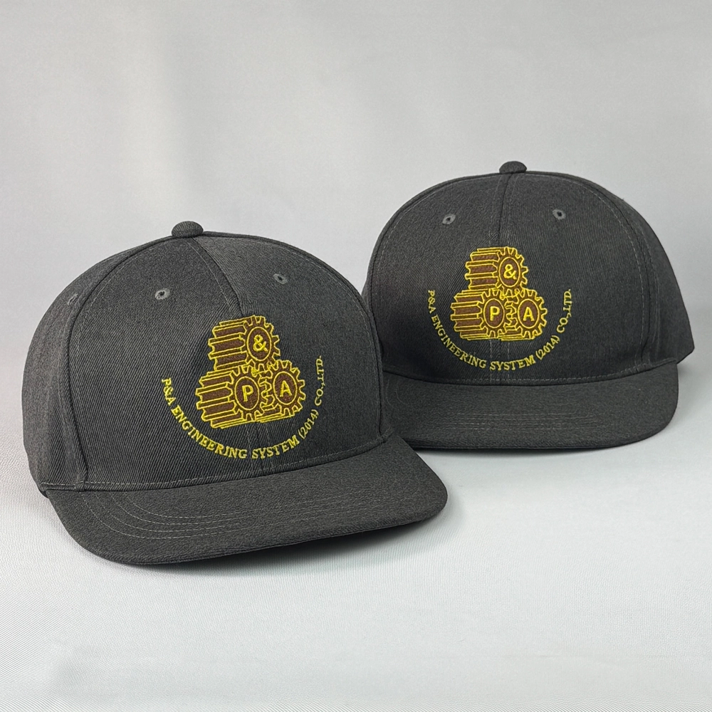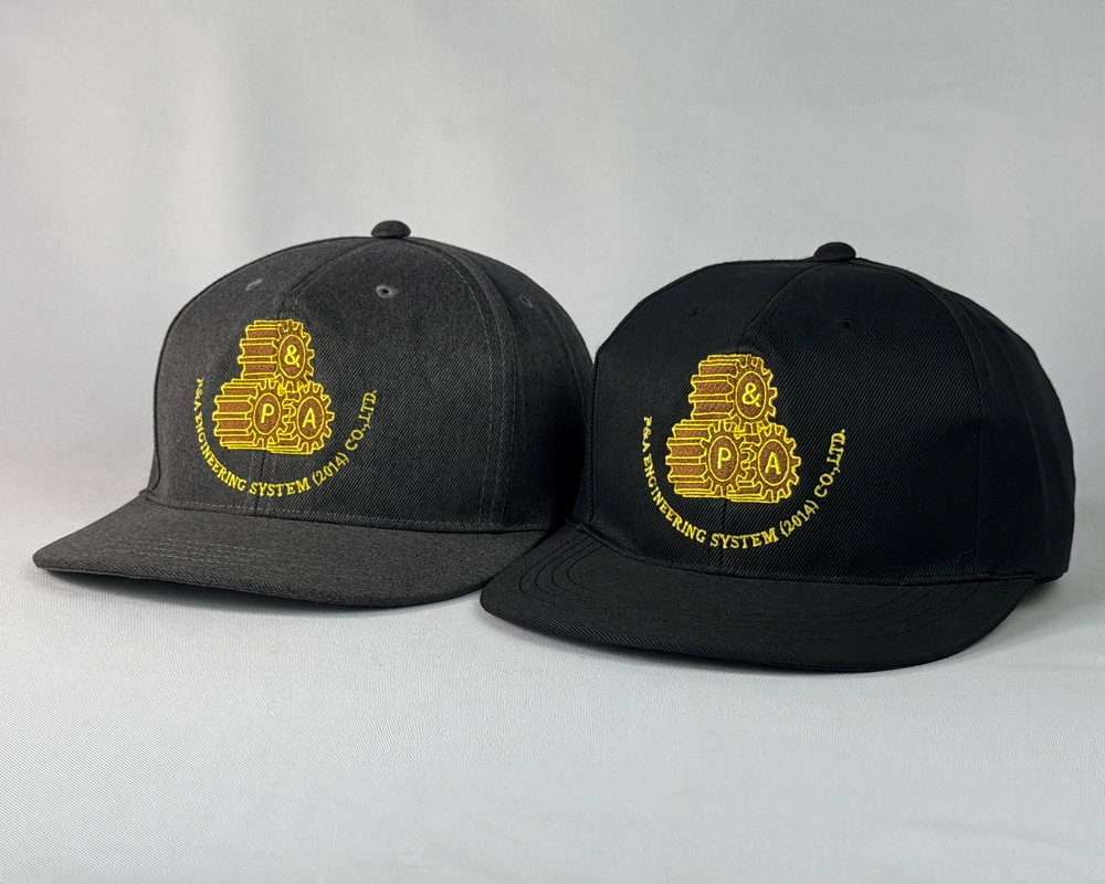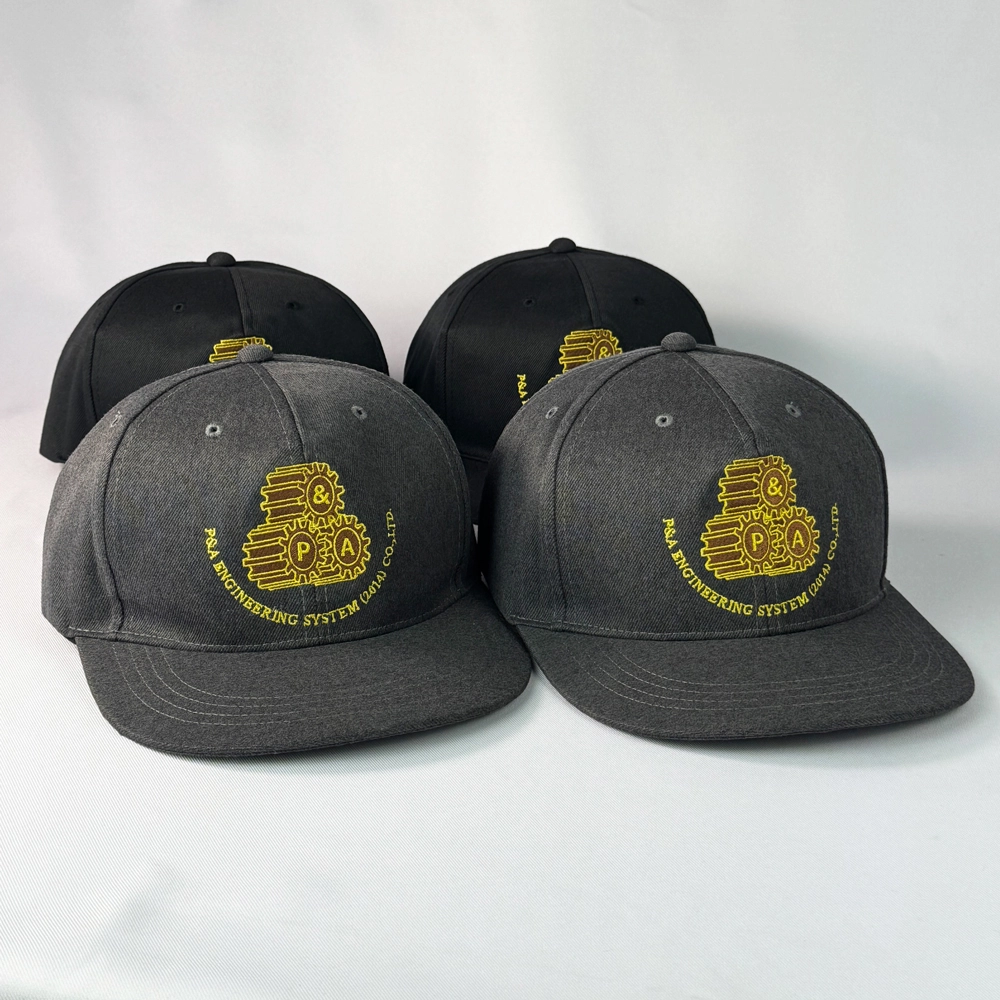 ตัวอย่างงานผลิตหมวกฮิปฮอป 2 สี สีดำและสีเทา พร้อมงานปักโลโก้ 2 ตำแหน่งด้านหลัง และหลังหมวก